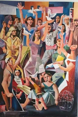 و كأن اللوحة تخلّد مشهداً عن ترابط الجماهير في لحظة فرحٍ فُتحت فيه أبواب القفص الحديدي لينطلق منه الحمام نحو سماء الحرية .